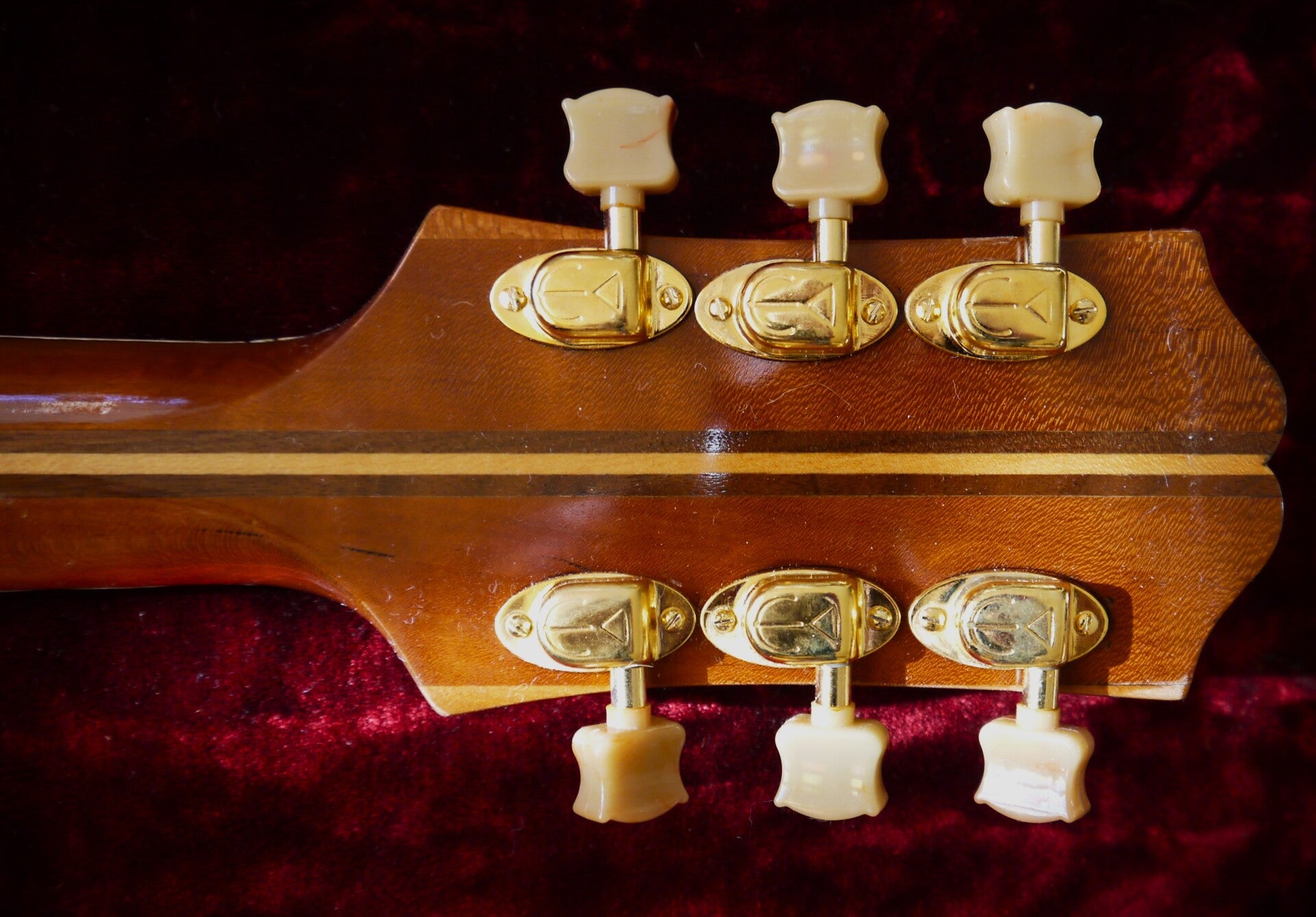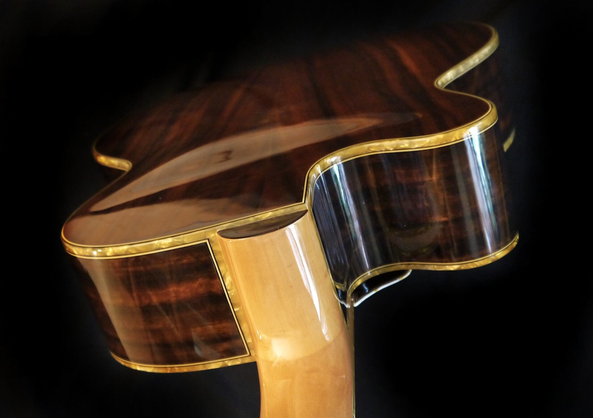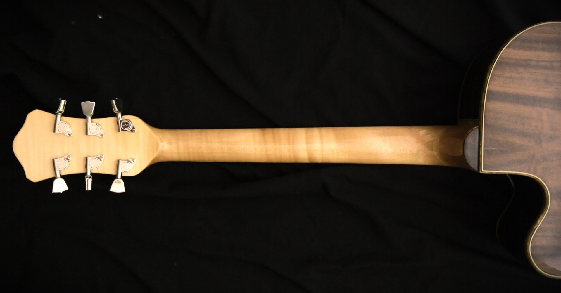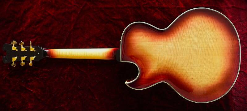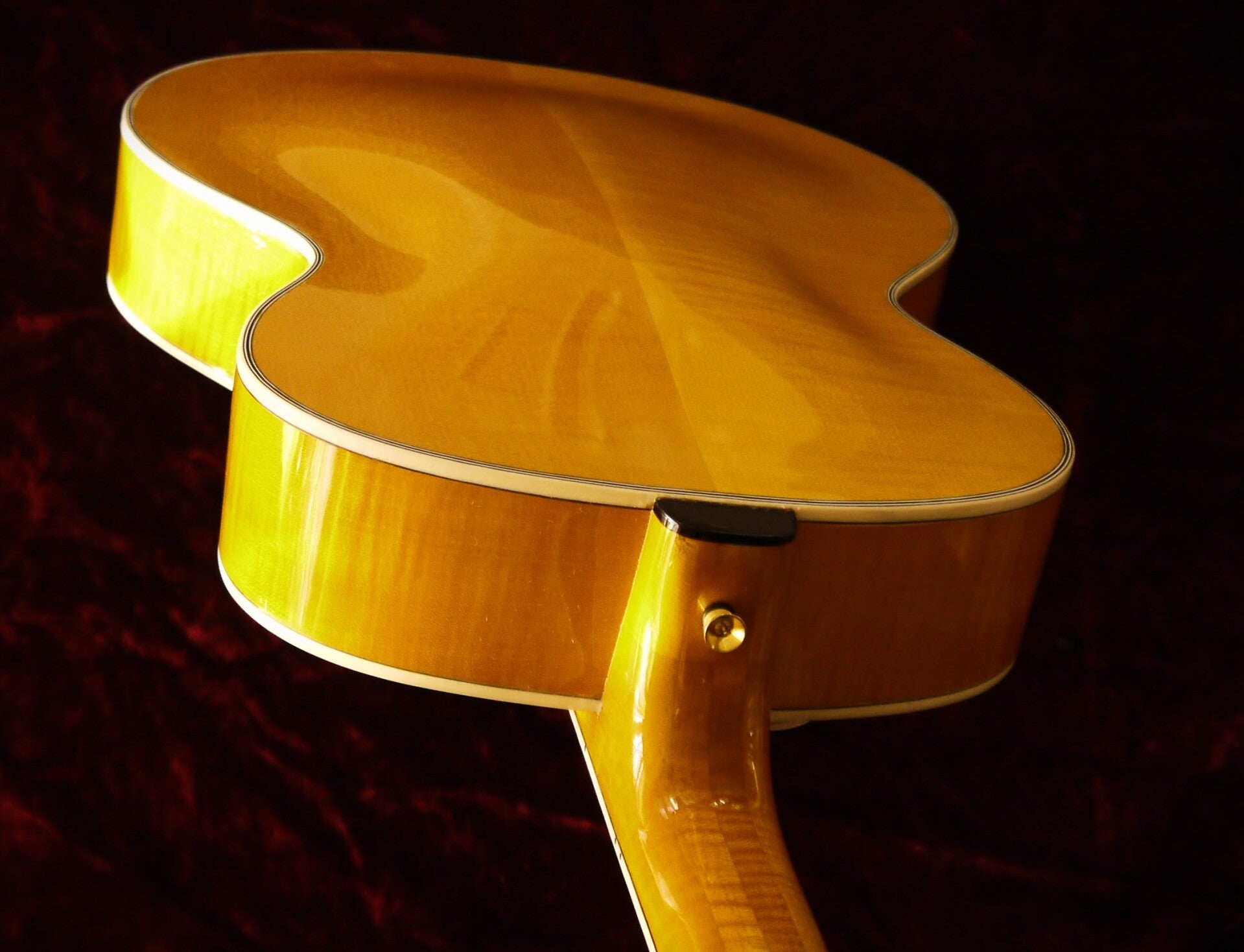 Die Zargen und der 3-teilige Hals sind ebenfalls aus tief geflammtem Ahorn. Bindings am Korpus, Griffbrett, Kopfplatte, Hals – Korpus Verbindung als verdeckter Schwalbenschwanz, wobei der Hals über dem Korpus „schwebt“, Kopfplatten beidseitig aus Ebenholz, Ebenholzgriffbrett mit Abalone – Perlmutt Einlage