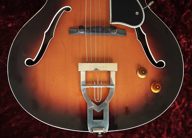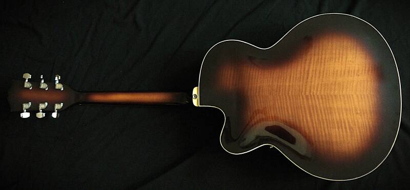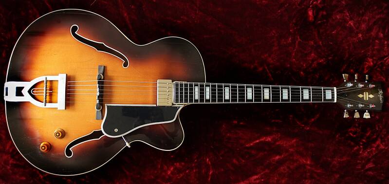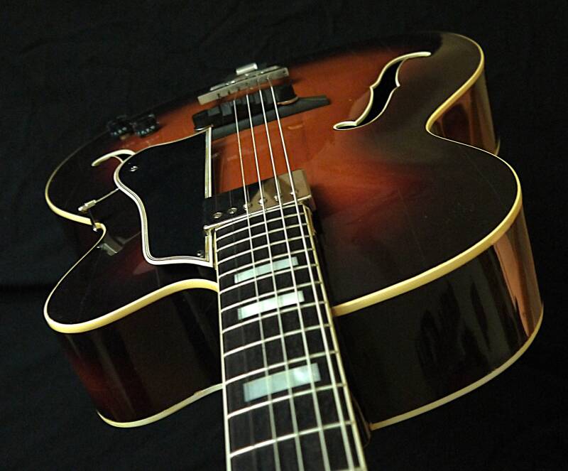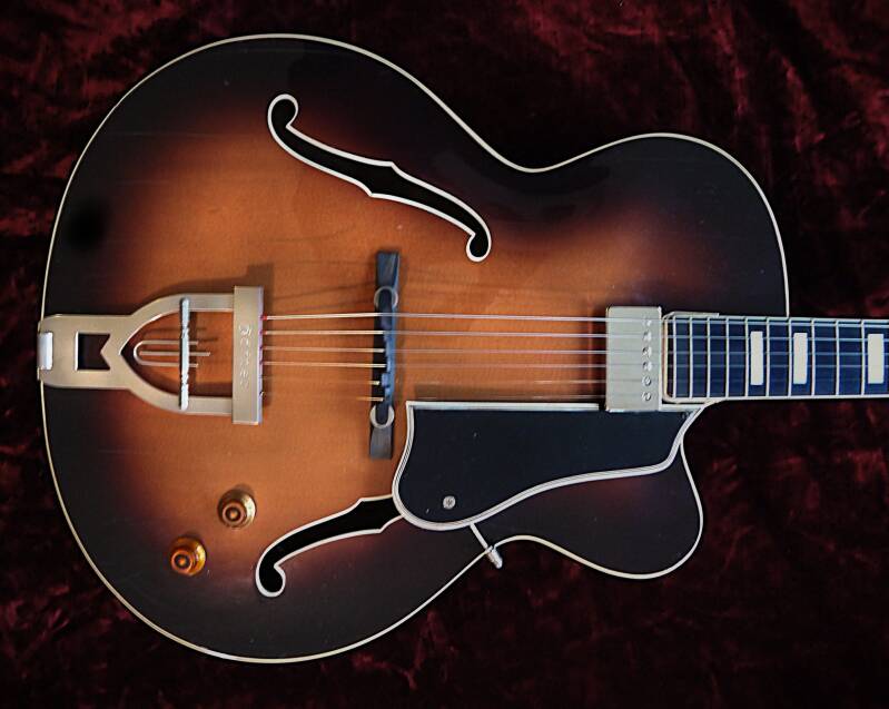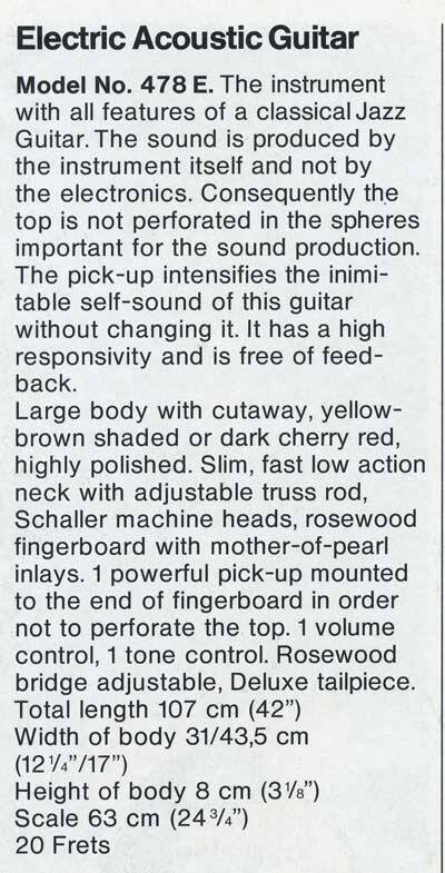Modell Nr. 478 E. Das Instrument mit allen Merkmalen einer klassischen Jazzgitarre. Der Klang wird vom Instrument selbst und nicht von der Elektronik erzeugt. Folglich ist die Decke in den für die Klangerzeugung wichtigen Bereichen nicht perforiert. Der Tonabnehmer verstärkt den unverwechselbaren Eigenklang dieser Gitarre, ohne ihn zu verändern. Er hat eine hohe Ansprache und ist frei von Rückkopplungen.
