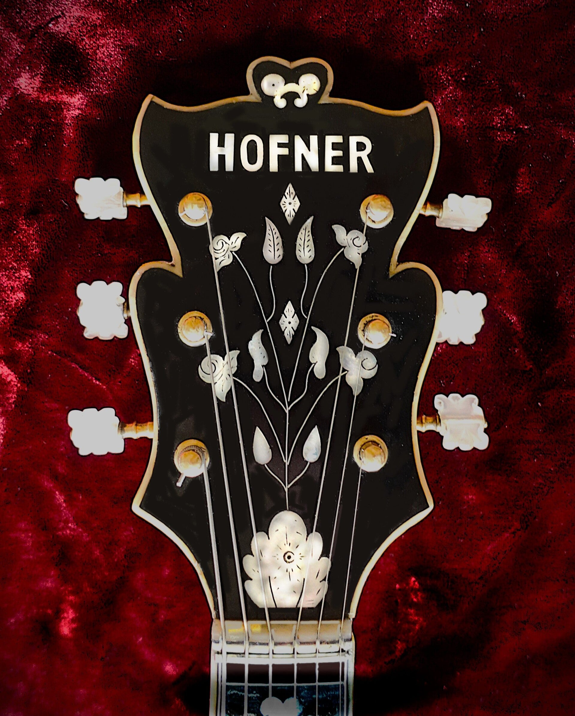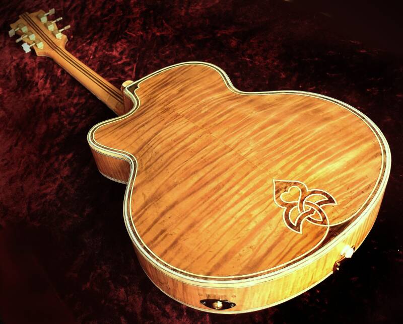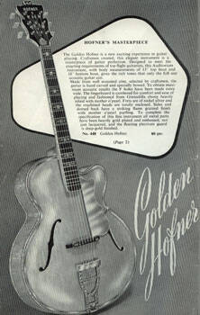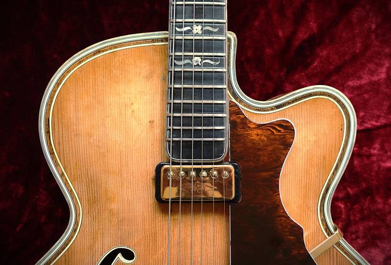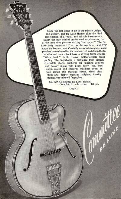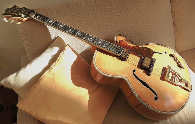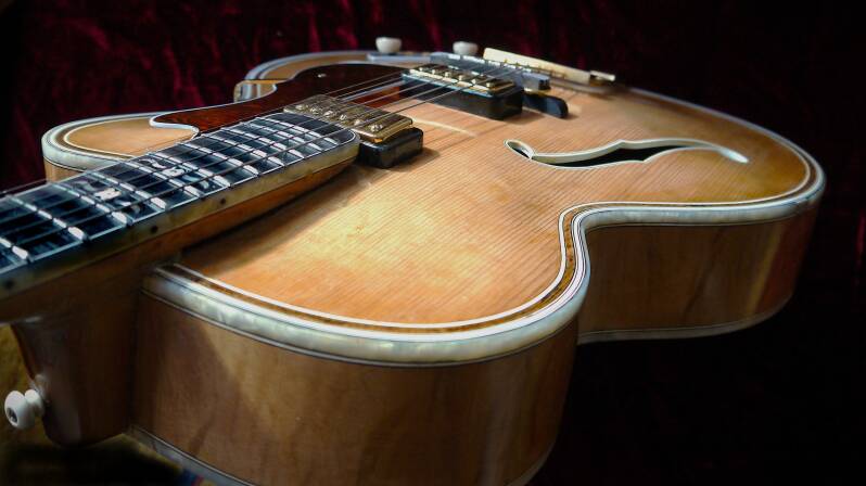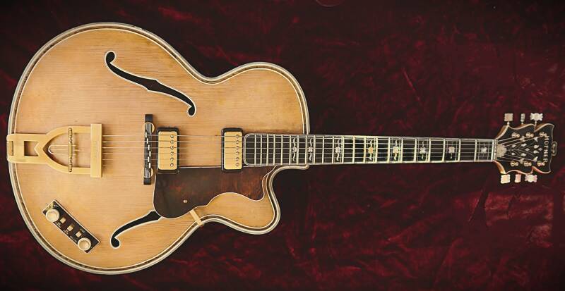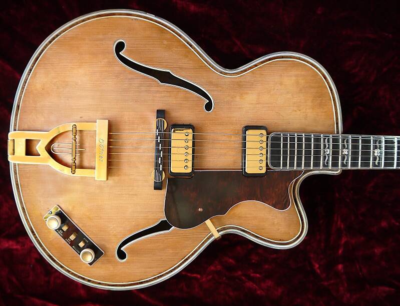 Archtop-Gitarre, hergestellt in Deutschland, Seriennummer 128, blonde Oberfläche mit geringfügigen Oberflächenunregelmäßigkeiten, Das Hofner Committee Deluxe Modell ist das seltenste Hofner-Modell mit nur etwa 30 gefertigten Stück. Es war der Vorläufer des sehr begehrten Hofner Golden Modells.